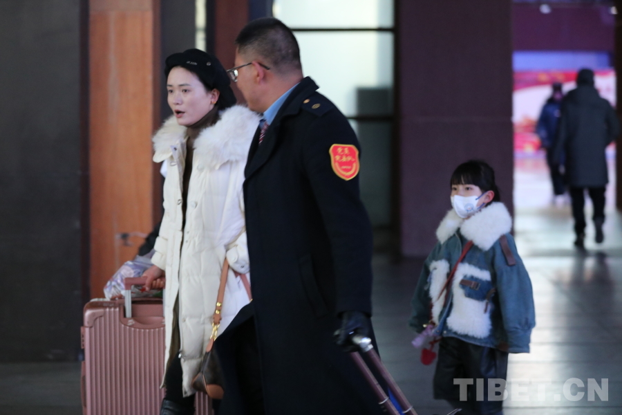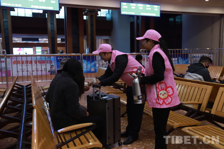 圖為拉薩車(chē)站春運(yùn)首日志愿者為候車(chē)旅客服務(wù)