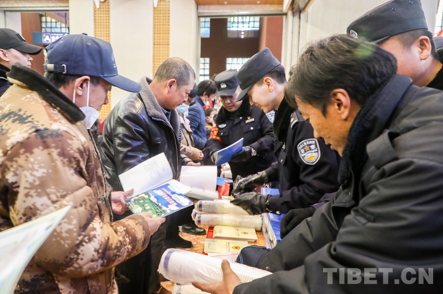 圖為春運首日,西藏自治區(qū)司法廳聯(lián)合黨委政法委護路辦、拉薩鐵路公安處等單位在拉薩站區(qū)開展普法宣傳活動攝影:黃飛