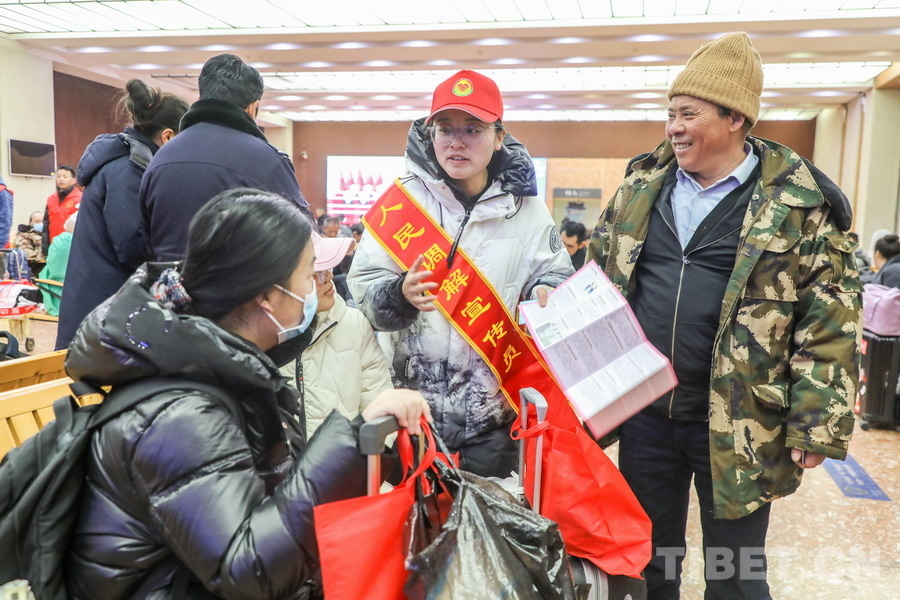圖為西藏自治區(qū)司法廳人民調(diào)解宣傳員向在藏務工返鄉(xiāng)旅客講解相關法律常識攝影:黃飛