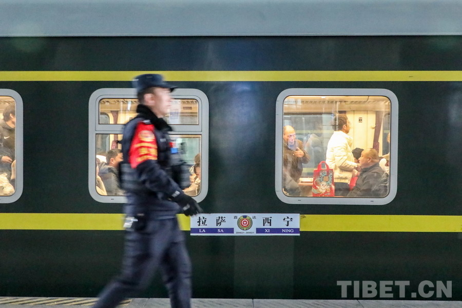 圖為春運首日,拉薩站派出所民警普布在站臺巡視攝影:黃飛