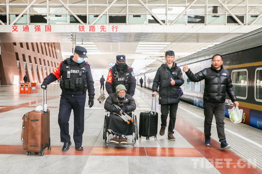 圖為拉薩站派出所民警羅松達哇(左二)與同事一起幫助殘疾旅客快速進站,旅客豎起大拇指并不斷地說“托切那(謝謝)”攝影:黃飛