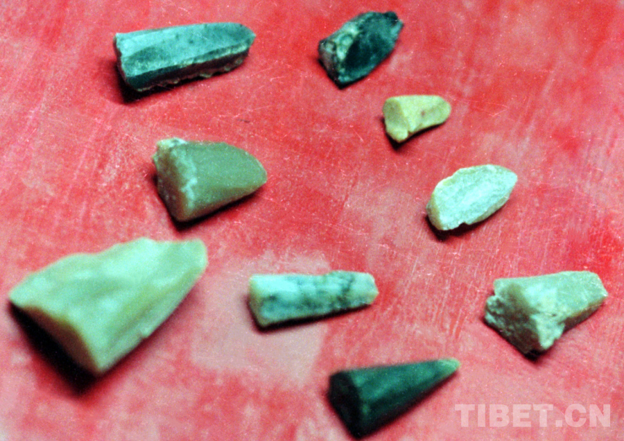 圖為在巴毛瓊宗等地所發(fā)現(xiàn)的古人類所留下的打制石器(唐召明2002年攝)