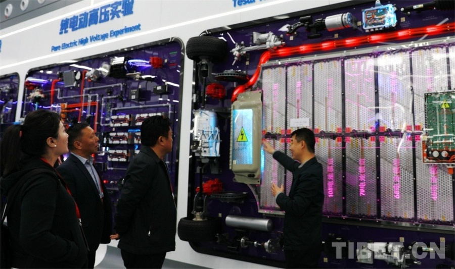 “這是由7104節(jié)電池組成的特斯拉的電池組,它是402伏的高壓電。所以,沒有經(jīng)過專業(yè)培訓(xùn)進(jìn)行電動(dòng)汽車維修會(huì)有一定的危險(xiǎn)性?!北狈絿H汽車教育展廳、車間負(fù)責(zé)人黨超為到訪的西藏自治區(qū)工商聯(lián)民營企業(yè)家赴京學(xué)習(xí)參觀團(tuán)一行詳細(xì)介紹著墻上展示的電池組。大家聽得津津有味。