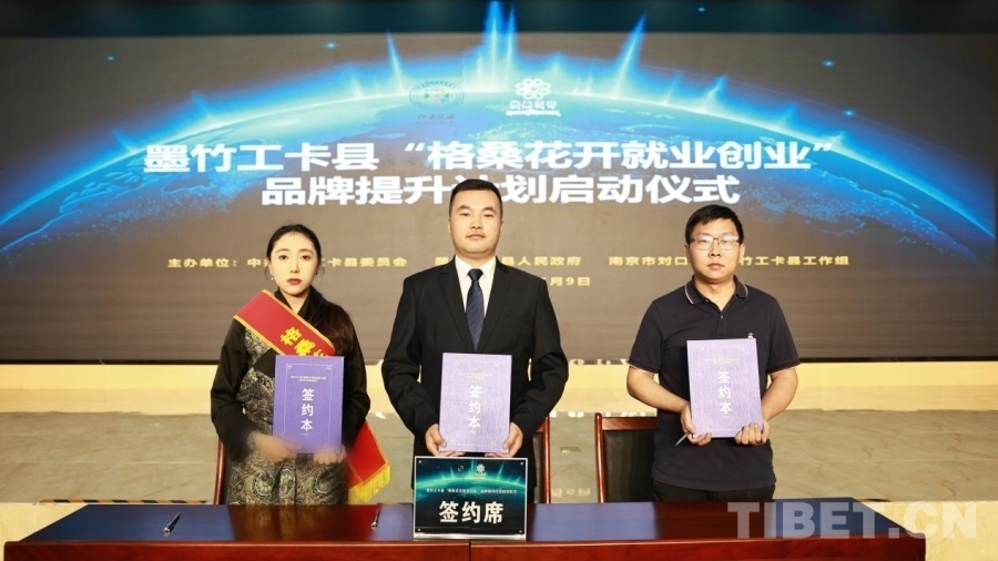 圖為貢覺卓瑪(左一)參加墨竹工卡縣舉辦的“格?;ㄩ_就業(yè)創(chuàng)業(yè)”品牌提升計劃啟動儀式并簽訂合作協(xié)議
