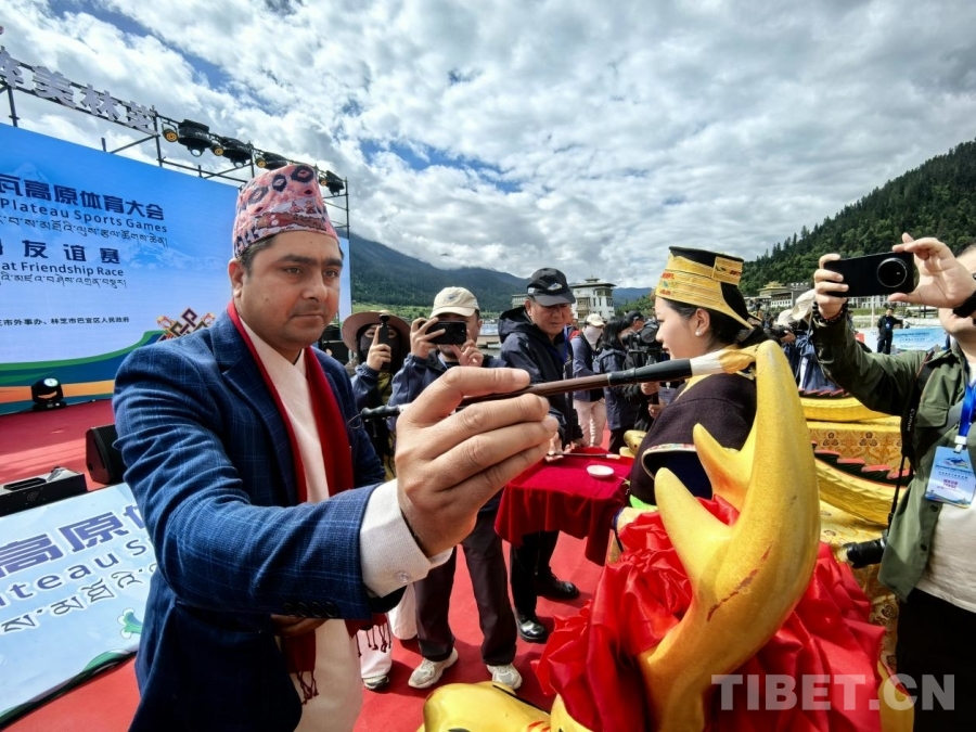 6月15日,14支國內外隊伍參加2025年西藏林芝南迦巴瓦高原體育大會——中尼高原龍舟友誼賽。圖為尼泊爾代表為龍點睛 攝影:王淑