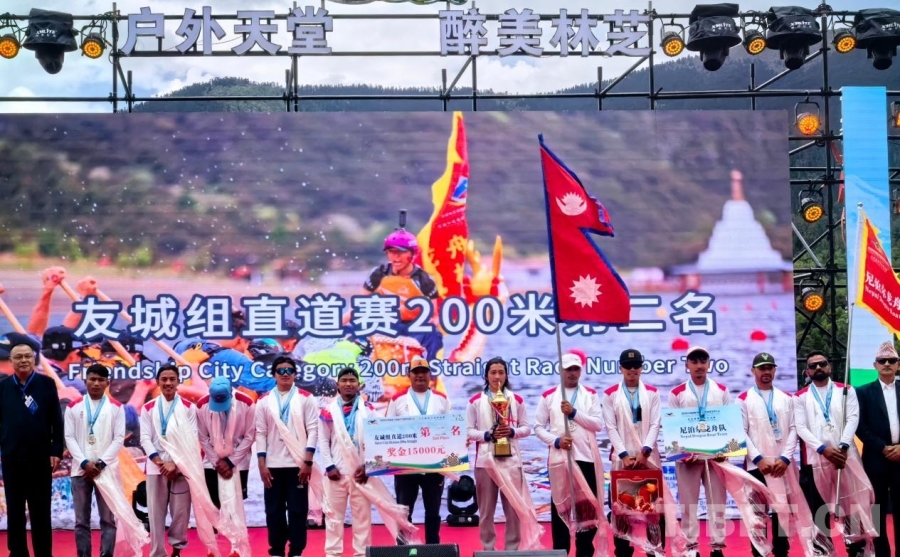 6月15日,14支國內外隊伍參加2025年西藏林芝南迦巴瓦高原體育大會——中尼高原龍舟友誼賽。圖為尼泊爾隊獲得友城組直道賽200米第二名 攝影:王淑