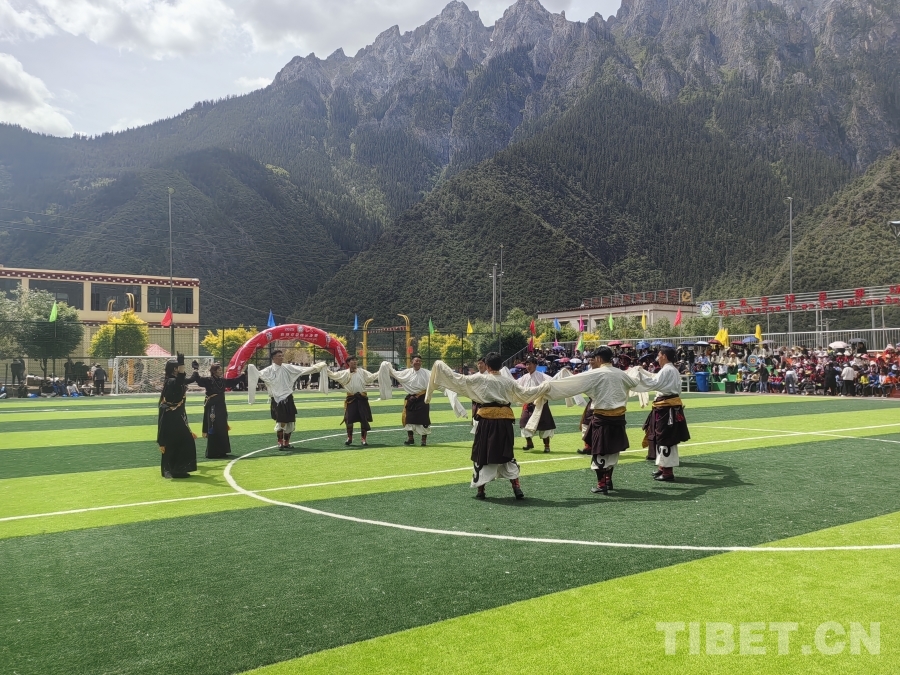 圖為西藏洛隆縣達(dá)龍鄉(xiāng)第二屆中遠(yuǎn)海運(yùn)鄉(xiāng)村足球聯(lián)賽“吉祥杯”開幕式上的舞蹈表演
