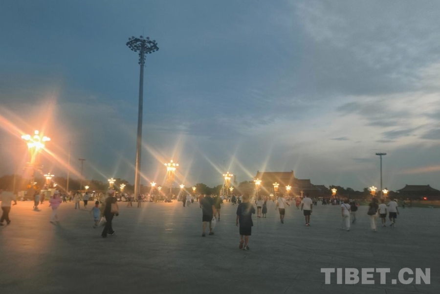 圖為參加“山河同脈·京華筑夢(mèng)”研學(xué)活動(dòng)的西藏日喀則定日縣中學(xué)生們?cè)谔彀查T廣場(chǎng) 攝影:張?jiān)?/p>