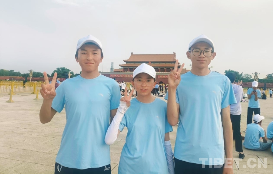 暑期的天安門廣場(chǎng)更加熱鬧,不僅有一家老幼同游的家庭,有旅行社帶來(lái)的各地旅游團(tuán),最多的是各種學(xué)校、團(tuán)體組織的大大小小的學(xué)生團(tuán),他們身著不同顏色款式的服裝,共同等待著激動(dòng)人心的時(shí)刻。“山河同脈·京華筑夢(mèng)”研學(xué)團(tuán)的少年們便是其中一員,他們穿著淺藍(lán)色的T恤,戴著白色的棒球帽,散發(fā)著西藏少年的朝氣。