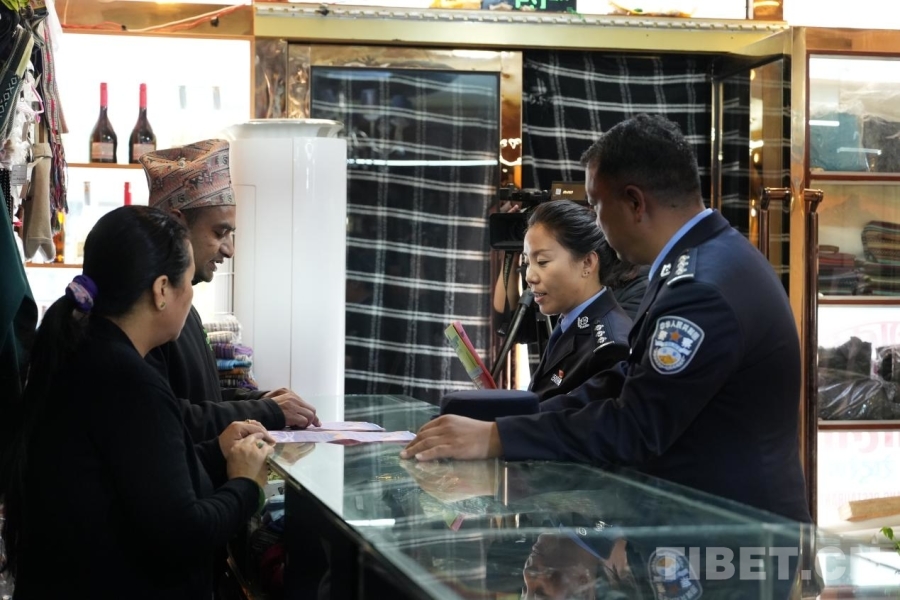 圖為吉隆鎮(zhèn),在尼籍網(wǎng)格聯(lián)絡(luò)員嘎杰姆·斯里斯特(左一)的門(mén)店,吉隆口岸公安分局出入境管理大隊(duì)民警羅珍(右二)正進(jìn)行日常走訪(fǎng)宣講 攝影:邊子捷