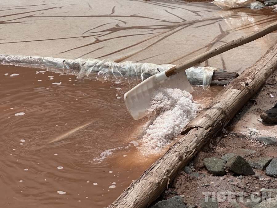 鹽田里,78歲的江羊巴桑正彎腰勞作,傳承著千年不變的制鹽技藝。江羊巴桑是白扎鹽場(chǎng)的一名鹽工,鹽是他們一家人賴以生存的東西,父輩靠鹽養(yǎng)活了他,他也靠著鹽養(yǎng)大了自己的十一個(gè)孩子。這位老鹽工曾在綜藝節(jié)目《種地吧》向觀眾展示了當(dāng)?shù)厝斯欧ㄖ汽}的智慧。他在節(jié)目中表示:“為了養(yǎng)活一家老小,從小就開始制鹽,一直干到現(xiàn)在。以后無(wú)論是我的兒子,還是這個(gè)地區(qū)的年輕人,希望未來(lái)可以學(xué)習(xí)并延續(xù)好這一制鹽技藝?!苯虬蜕:?jiǎn)單而真摯的愿望,就是希望這種傳統(tǒng)的手工制鹽能夠代代相傳。