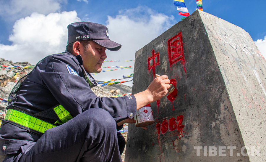 圖為日喀則邊境管理支隊霍爾巴邊境派出所民警為紀(jì)念中國人民抗日戰(zhàn)爭暨世界反法西斯戰(zhàn)爭勝利80周年開展界碑描紅 攝影:楊承旭