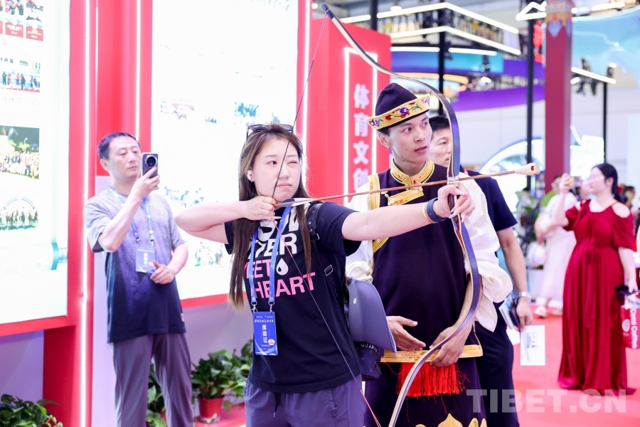 專業(yè)藝術(shù)團精心排演的《幸福西藏》節(jié)目在西藏展廳輪番展演;搭建響箭、秀茲(藏式骰子)體驗區(qū),高度還原世界海拔最高的龍舟賽——西藏自治區(qū)端午節(jié)牛皮船(龍舟)賽開幕式場景,吸引了廣大游客駐足觀看,踴躍參與民族傳統(tǒng)體育項目,參與“畫龍點睛”儀式。另外精心準備的體育文創(chuàng)產(chǎn)品,深受游客喜愛,爭相領(lǐng)取。