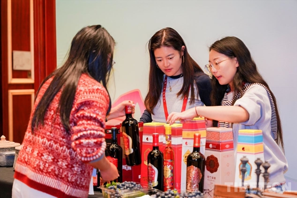 圖為工作人員為現(xiàn)場嘉賓介紹桑日帕竹紅酒