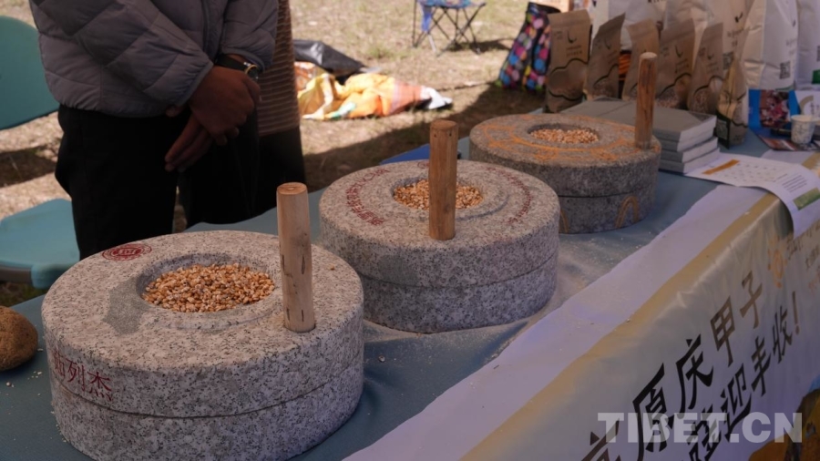 圖為茹列杰展銷點(diǎn)展示的磨糌粑用的石磨