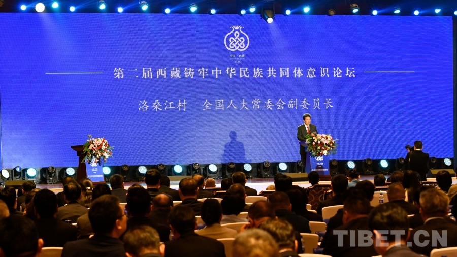 圖為全國人大常委會副委員長洛桑江村在第二屆西藏鑄牢中華民族共同體意識論壇上致辭 攝影:趙振宇
