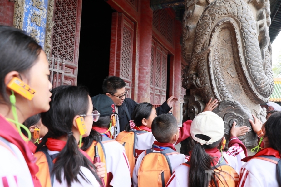 圖為西藏阿里噶爾縣孔繁森小學(xué)的孩子們?cè)谏綎|曲阜孔廟大成殿外用手感受殿外盤龍巨柱透雕工藝 攝影:劉莉