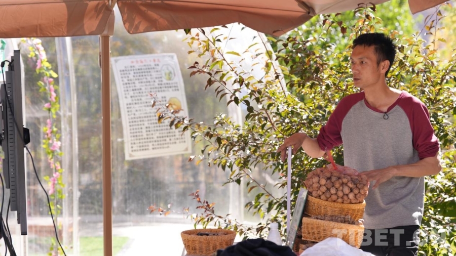 圖為村民在千年核桃林中進(jìn)行直播,銷(xiāo)售剛采收的新鮮核桃