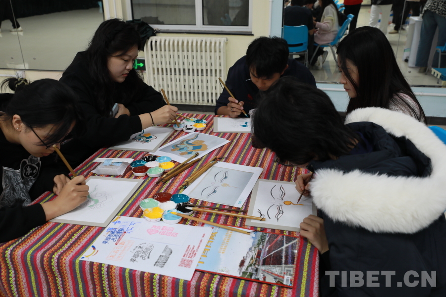 圖為同學們在活動現(xiàn)場體驗傳統(tǒng)唐卡繪畫。攝影:畢然