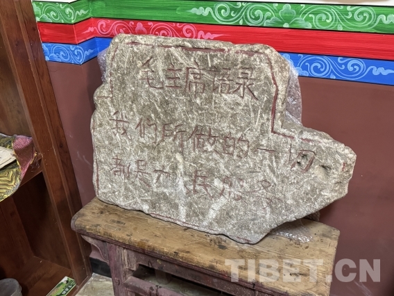 如今,松安寺內有一座專門設立的紅色文物陳列室,長青介紹道,這座紅色文物陳列室是現(xiàn)任活佛羅讓甲央在當?shù)卣С窒禄I建而成。陳列室廣泛收集了有關紅色文物進行集中展示,供僧眾和信教群眾參觀學習。有一塊石刻被視為“鎮(zhèn)館之寶”,上面刻著毛主席的語錄“我們所做的一切都是為人民服務”。石刻是寺廟在維修僧房時從房基下發(fā)現(xiàn)而挖出的,年代久遠,也見證了歷史里精神的傳承。