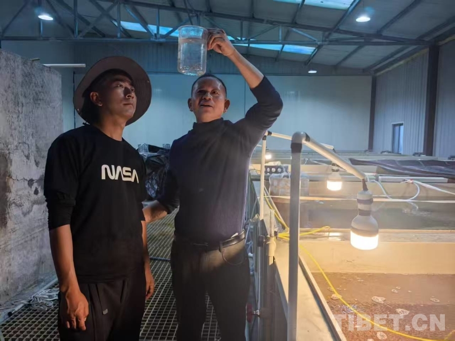 圖為駱明飛(右)帶徒弟尼瑪旺堆學習如何科學觀察魚苗的繁育過程 受訪者供圖
