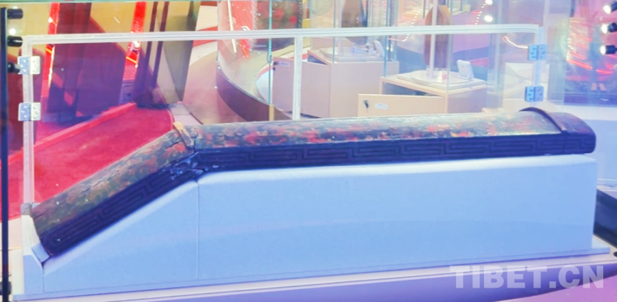 我們看到,雖然歷經(jīng)千年,琴與長(zhǎng)鼓仍色澤鮮艷,保存完好。整體呈亞腰形,兩端配備皮帶,可系于腰間,長(zhǎng)鼓中間最細(xì)窄之處可系繩便于安置在樂(lè)器架上。其表面精巧地髹飾著朱漆與黑漆,巧妙地描繪出寶相牡丹花、云頭紋和火焰紋。而擁有同樣花紋的木琴一端斜下折出鈍角,更見巧思。雖然木琴兩道岳山間原本的琴弦因年代久遠(yuǎn)沒有了,但我們?nèi)苑路鹉芟胂蟮?,入藏后的演奏中,琴弦聲聲,有長(zhǎng)安的溫婉綿長(zhǎng),也含雪域的雄渾遼闊,鼓聲陣陣,中原的節(jié)奏與雪域的韻律交織,和鳴穿越時(shí)空,在當(dāng)下奏出和諧樂(lè)章。這兩件公主的嫁妝,早已不是單純的器物,更承載著深厚的歷史文化底蘊(yùn),成為民族文化交融的鮮活注腳。