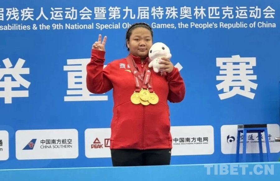 圖為特奧舉重女子90公斤級(jí)以上決賽中,運(yùn)動(dòng)員曲尼格桑奪得4枚金牌