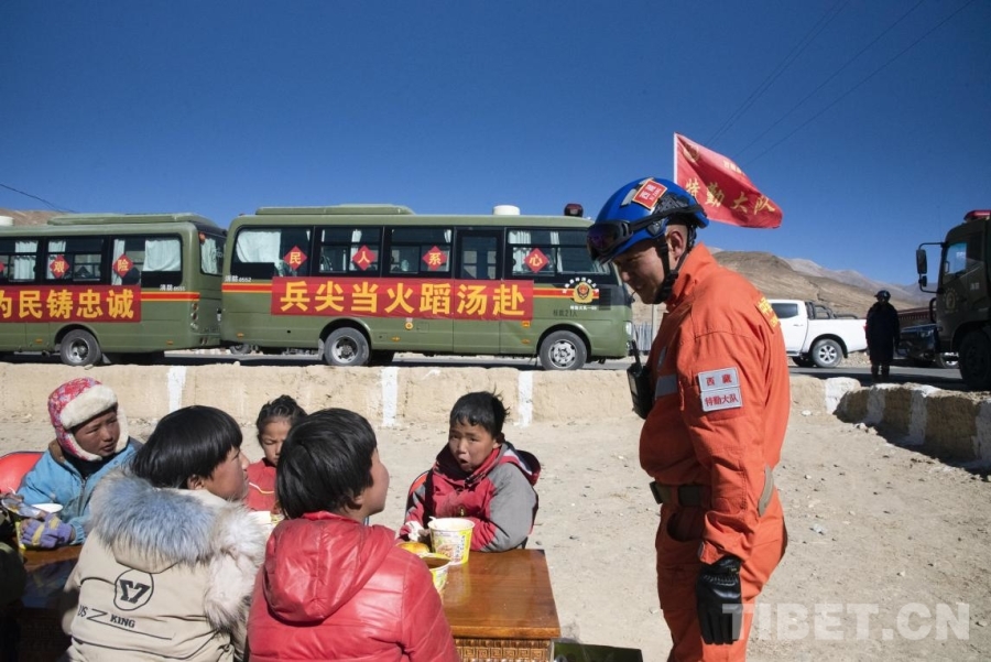 圖為在定日縣曲洛鄉(xiāng)措昂村受災安置點,拉薩森林消防大隊為受災小朋友搭建起的臨時“小飯桌”,為村中受災群眾提供熱乎的便餐。(攝于2025年1月8日) 攝影:趙振宇