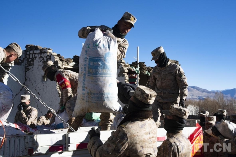 圖為在定日縣長所鄉(xiāng)嘎旦村解放軍官兵正在幫助受災群眾搬運社會各界所捐贈的物資(攝于2025年1月8日) 攝影:趙振宇