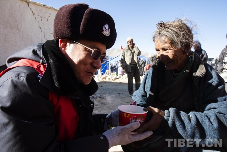 圖為在定日縣曲洛鄉(xiāng)措昂村受災安置點,剛剛換崗的公安民警將自己手中的早飯送到受災群眾的手中(攝于2025年1月9日) 攝影:趙振宇