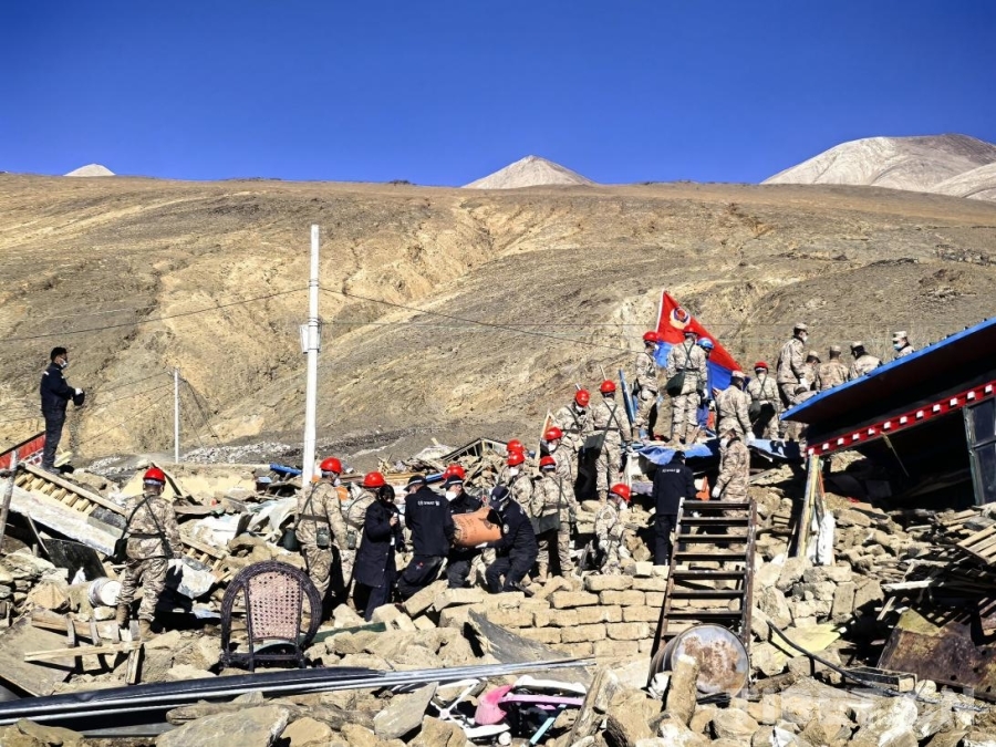 大地撕裂的瞬間,定日的山川記住了疼痛。這些影像定格了災難降臨時的原始模樣——倒塌的房屋、揚起的塵土、撕裂的大地。但在滿目瘡痍中,更震撼的是那些逆行身影:人民子弟兵、消防救援隊伍、移民管理警察、公安干警與當?shù)馗刹吭趶U墟上的緊急救援,一雙雙沾滿泥土的手在瓦礫中尋找生命的跡象。災難過后,是無數(shù)人日夜兼程奔赴的開始。
