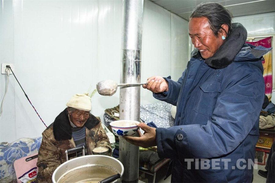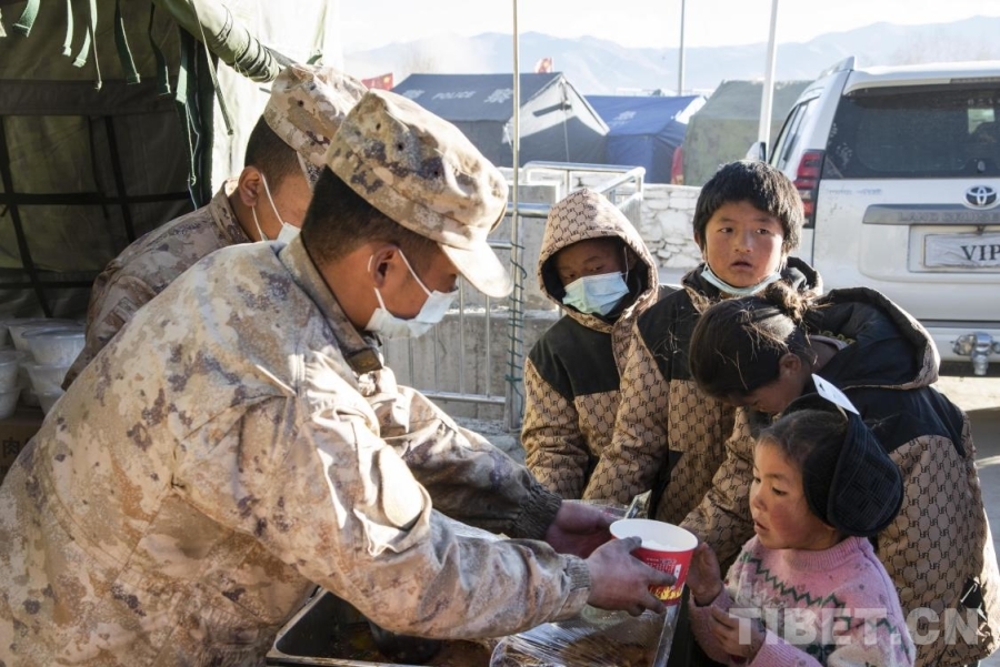 圖為在定日縣長所鄉(xiāng)古榮村安置點內(nèi),解放軍官兵為受災群眾提供一日三餐(攝于2025年1月11日) 攝影:趙振宇