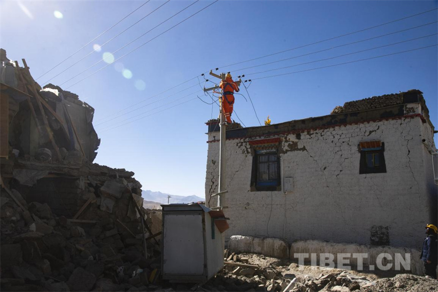圖為地震發(fā)生第三日,在定日縣長所鄉(xiāng)森嘎村國家電網(wǎng)工作人員為受災群眾安置點恢復電力供應(攝于2025年1月9日) 攝影:趙振宇