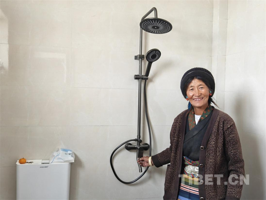 圖為日喀則市拉孜縣拉孜鎮(zhèn)措布村村民向記者展示自家新居內(nèi)的淋浴設施,臉上洋溢著幸福的笑容(攝于2025年10月30日) 攝影:次旦拉姆