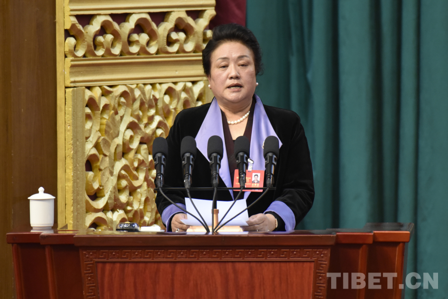 西藏自治區(qū)政協(xié)黨組成員、副主席卓嘎代表政協(xié)第十二屆西藏自治區(qū)委員會(huì)常務(wù)委員會(huì)向大會(huì)報(bào)告政協(xié)十二屆三次會(huì)議以來(lái)的提案工作情況。(中國(guó)西藏網(wǎng) 記者/王淑 趙振宇)