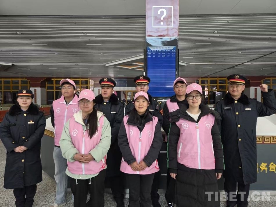 圖為拉薩車站工作人員和志愿者護(hù)航旅客平安春運(yùn)