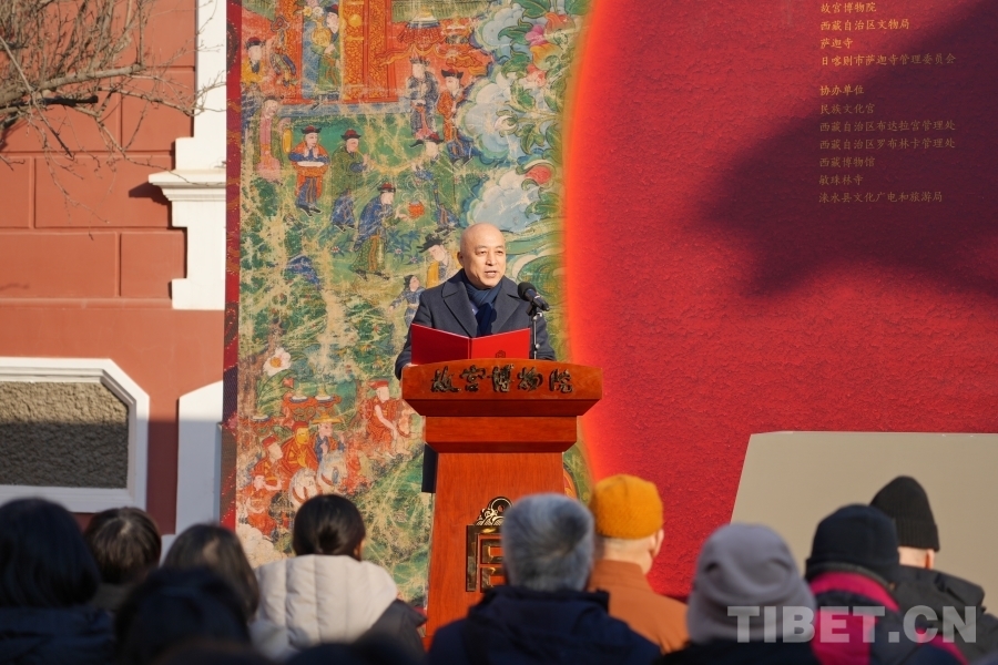 展覽開幕式現(xiàn)場(chǎng),文化和旅游部黨組成員、故宮博物院院長(zhǎng)王旭東,西藏自治區(qū)人民政府黨組成員、副主席徐志濤,故宮博物院原院長(zhǎng)鄭欣淼,中國(guó)文物保護(hù)基金會(huì)理事長(zhǎng)劉玉珠,中國(guó)佛教協(xié)會(huì)會(huì)長(zhǎng)演覺,中國(guó)古跡遺址保護(hù)協(xié)會(huì)理事長(zhǎng)宋新潮,國(guó)家民族事務(wù)委員會(huì)古籍整理研究室一級(jí)巡視員孫繼為,故宮博物院黨委書記、副院長(zhǎng)都海江,文化和旅游部非物質(zhì)文化遺產(chǎn)司二級(jí)巡視員張玲,西藏自治區(qū)人民政府辦公廳二級(jí)巡視員旦巴央培,西藏自治區(qū)文化廳黨組成員、西藏自治區(qū)文物局黨組書記、副局長(zhǎng)趙興邦,全國(guó)政協(xié)委員、薩迦寺寺管會(huì)常務(wù)副主任洛卓加措,香港賽馬會(huì)慈善事務(wù)部主管葉巧兒出席。文化和旅游部、國(guó)家文物局下屬文博單位,西藏自治區(qū)人民政府下屬相關(guān)單位,北京市人民政府下屬相關(guān)單位,本次展覽的獨(dú)家捐助方公益慈善研究院,相關(guān)協(xié)會(huì)、學(xué)會(huì)、基金會(huì),各參展單位,特邀相關(guān)業(yè)務(wù)合作單位等也現(xiàn)場(chǎng)出席。