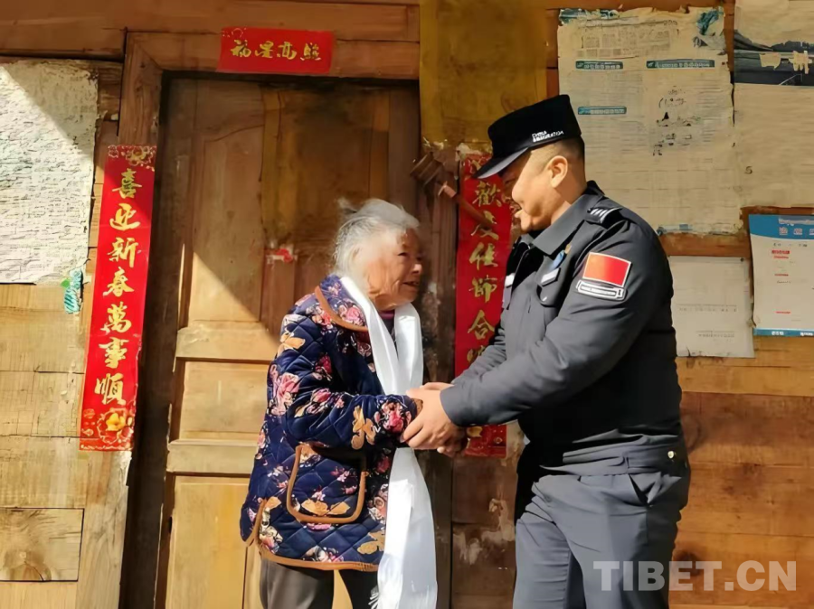 圖為2023年,竹瓦根邊境派出所民警仁青達(dá)瓦在春節(jié)期間看望卓給老人