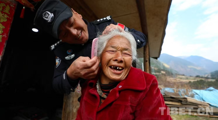 圖為輔警羅桑次仁給卓給老人梳頭發(fā)