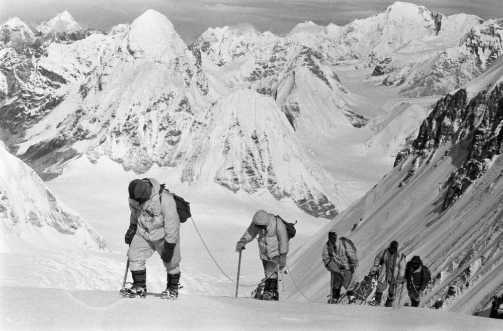 中國登山隊(duì)隊(duì)員在海拔7150米的冰雪坡上行進(jìn),照片拍攝于1960年5月。圖片來源:新華社