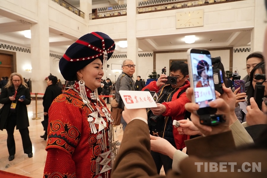 西藏代表團(tuán)格桑卓瑪代表接受媒體采訪 攝影:邊子捷