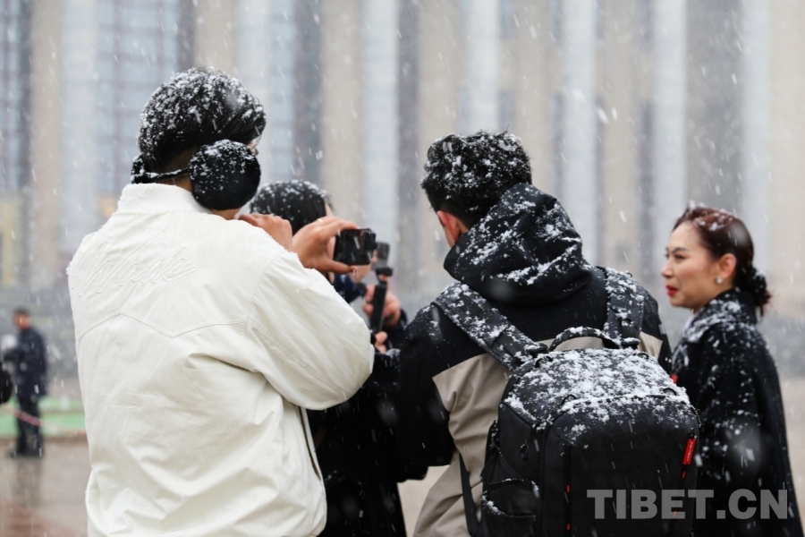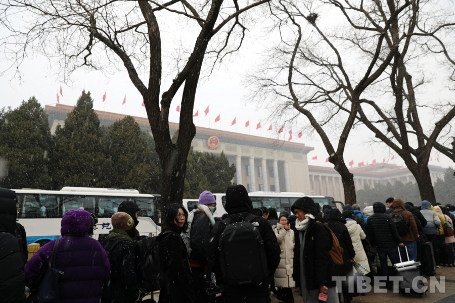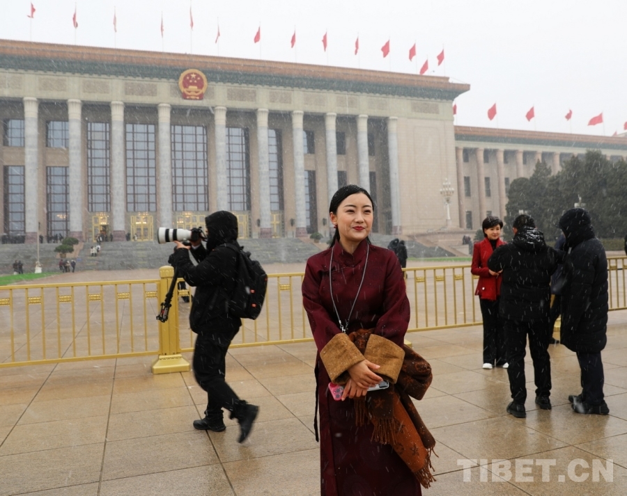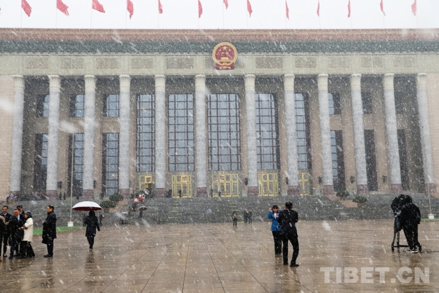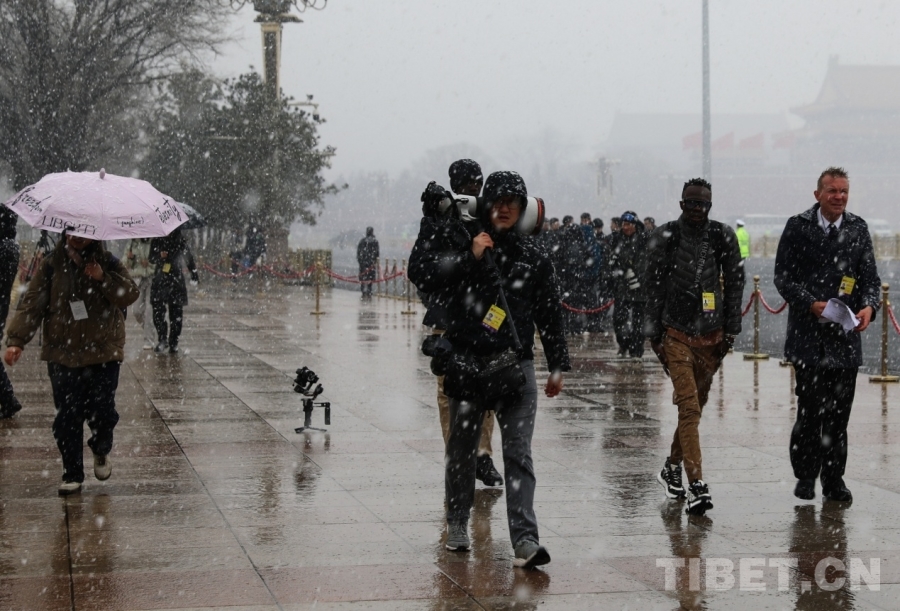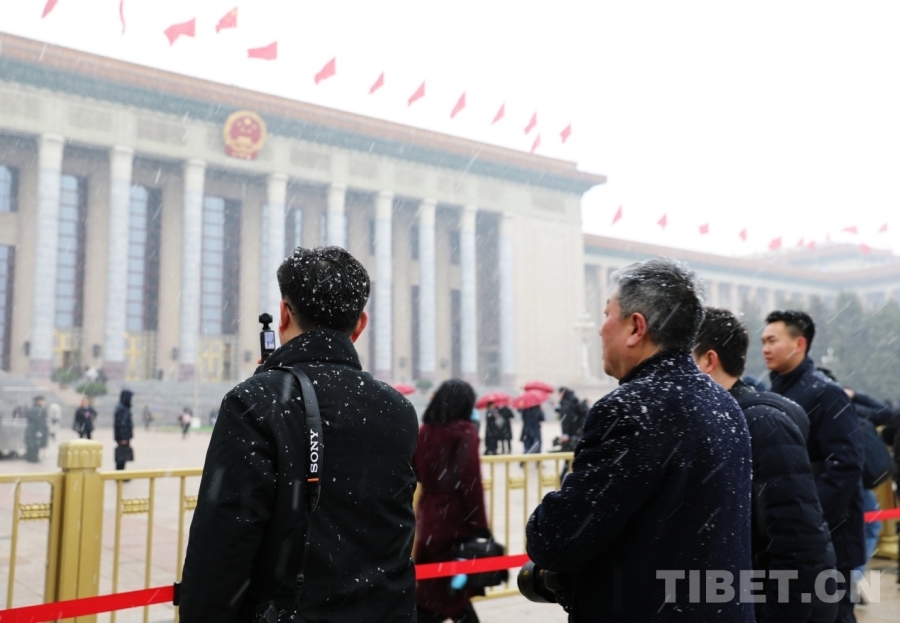 3月4日上午,十四屆全國人大四次會議舉行預備會議。會議結束后,一場春雪不期而至。在紛揚的大雪中,康巴衛(wèi)視記者正在工作。攝影:劉莉