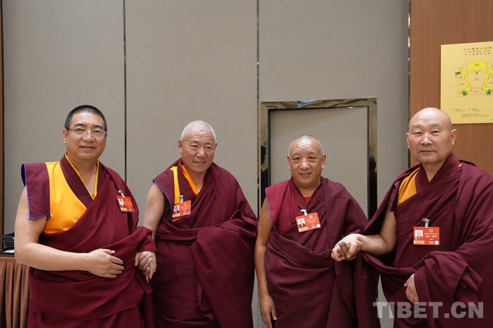 兩會喜相逢,多位宗教界政協(xié)委員在會議間歇合影留念,從左至右分別為:賽赤·確吉洛智嘉措、江白拉桑、扎西堅才、桑杰·嘉措