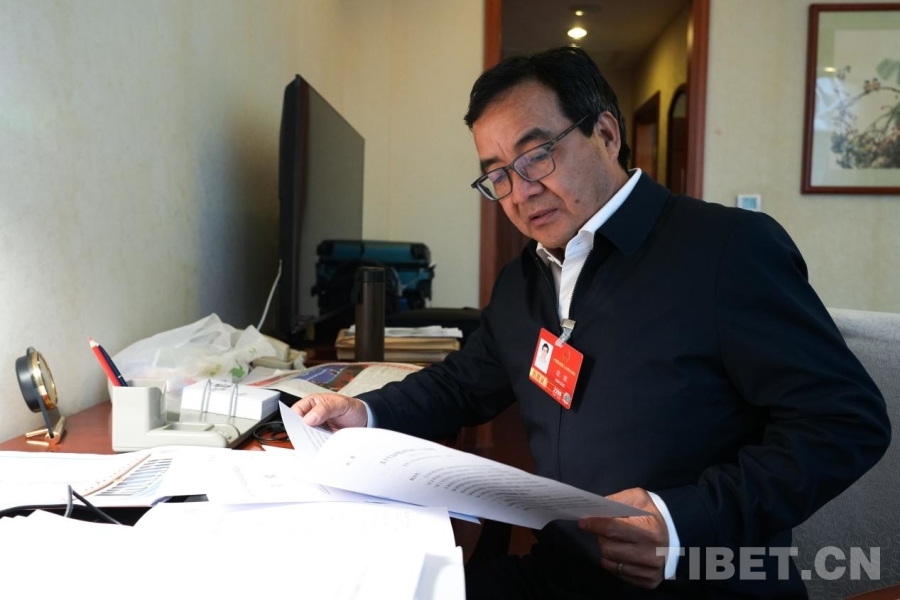 全國(guó)人大代表、西藏大學(xué)生態(tài)環(huán)境學(xué)院教授拉瓊在駐地看文件