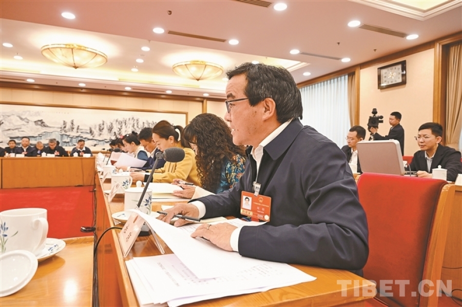 兩會(huì)期間,西藏代表團(tuán)舉行全體會(huì)議,拉瓊在會(huì)上發(fā)言。來(lái)源:西藏日?qǐng)?bào)