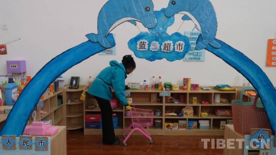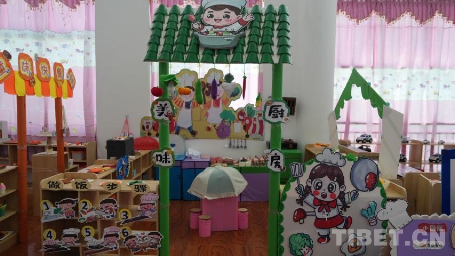 活動(dòng)室內(nèi),分區(qū)域模擬了娃娃家、警察局、理發(fā)店、小廚房、超市、醫(yī)院等生活場(chǎng)景。“大部分小朋友還處于不識(shí)字的階段,所以我們盡量用圖片等形式幫助他們理解每個(gè)場(chǎng)景、每個(gè)步驟。”在這個(gè)手工打造的小小“社區(qū)”里,孩子們通過(guò)角色扮演,模擬超市選購(gòu)與結(jié)賬、醫(yī)院掛號(hào)就醫(yī)、照顧家庭成員、理發(fā)、烹飪等生活場(chǎng)景。如果發(fā)現(xiàn)其他小朋友的“不良”行為,甚至可以前去“警察局”按流程“報(bào)案”。不同于其他的商業(yè)化兒童場(chǎng)景模擬體驗(yàn)區(qū)域,拉孜縣第二幼兒園活動(dòng)室的道具大部分由教師們制作而成,手工打造的8個(gè)模擬場(chǎng)景盡顯用心和細(xì)致。