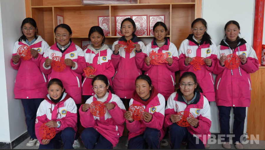 南木林縣第二中學(xué)學(xué)生展示各自創(chuàng)作的剪紙作品