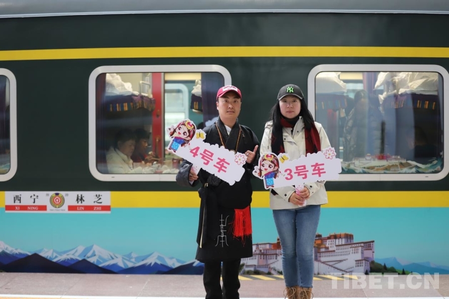 專列游客在林芝站與身著民族服飾的工作人員合影打卡