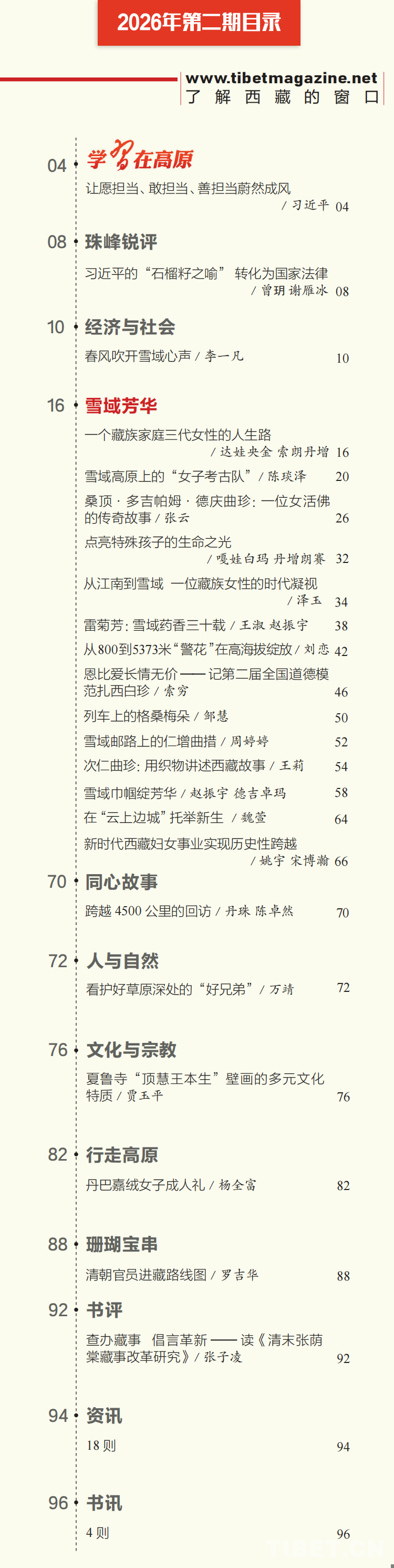“等閑識得東風(fēng)面,萬紫千紅總是春?!痹谶@春意盎然的時節(jié),《中國西藏》漢文版2026年第2期如期與讀者見面了。本期雜志是“雪域芳華”???,我們將目光投向雪域高原上的女性——她們是母親、是勞動者、是守護(hù)者,也是時代的書寫者。女性不僅見證了歷史的巨變,更以自身的堅韌與智慧,成為推動社會進(jìn)步不可或缺的力量。透過一個個鮮活的人物故事,本期??尸F(xiàn)雪域高原上那股堅韌且不斷生長的“她力量”。