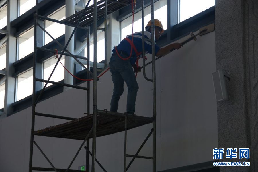 6月28日,在新建的青海省海西蒙古族藏族自治州格爾木火車站,工作人員在清潔車站內(nèi)壁。新華社記者 王浡 攝